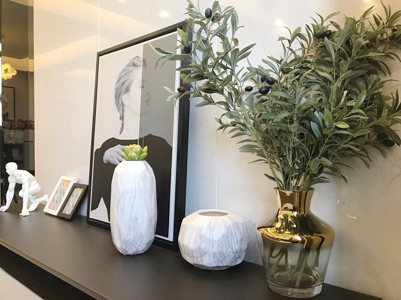 地面高档浅米色玻化砖搭配双层波导线,为客餐厅区域规划了明晰动线,更衬托出现代简约的精致,沙发的棉麻质地跳色,摈弃了繁杂、琐碎,只余下纯净的温暖。