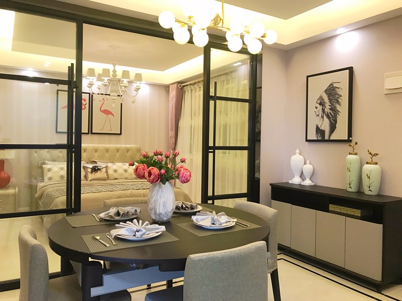 精致时尚的餐具摆件,客餐厅、卧室空间既区隔又浑然一体的设计,在温馨、柔和的灯光设计下,整个家的氛围更加浓烈。因为空间不大的关系,我们可以看到餐厅一旁的卧室采用了全透明的推拉玻璃门,增加了空间的通透性,至于隐私问题,设计师也做了安排,后期遮光帘到了就好啦。一切只因为,家的空间不大,只要有你就好。