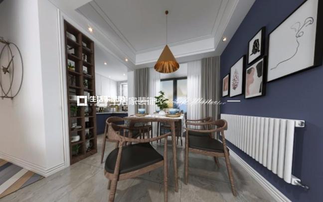 胡桃木色餐桌,和客厅家具融为一体;餐椅的皮质坐垫舒适而有档次。调色系灰蓝色背景墙,搭配挂画让整个空间显得更摩登和富有艺术气息。同时在色彩上与大门、厨房的橱柜相呼应。