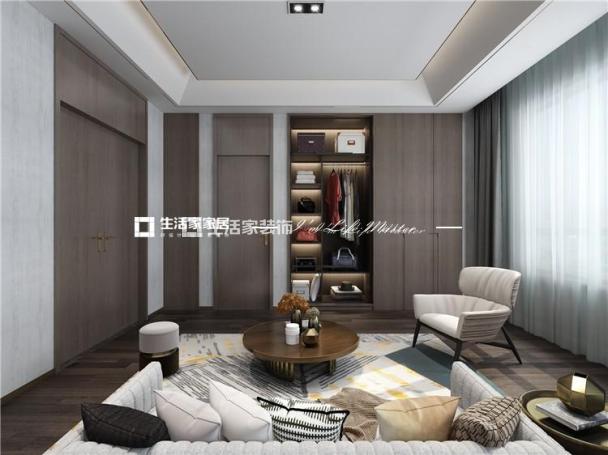 二楼主要以起居室为主,客厅正上方采用了挑空处理,让室内高度更加大气。挑空周边还做了钢琴摆放区域。因为室内承重墙体较少,只有承重立柱结构,所以为了每个卧室的实用性,在每个卧室都增加了独立衣帽间以及洗漱区域。每个房间还有独立的观景区域。客卧内以灰色、大地色为基调,隐喻出年轻的海派绅士的优雅,在温润、沉稳、经久耐看的质感中凸显时尚气息。床背的简约块状增强当代感。