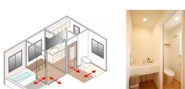 对于90平以下的小户型,建议做两式分离,即把洗脸台移出卫生间,放到公共空间与走廊融为一体;空间允许的话,推荐将洗面台和洗衣机放设置在同一个空间里形成一个紧凑式的洗衣洗面室。