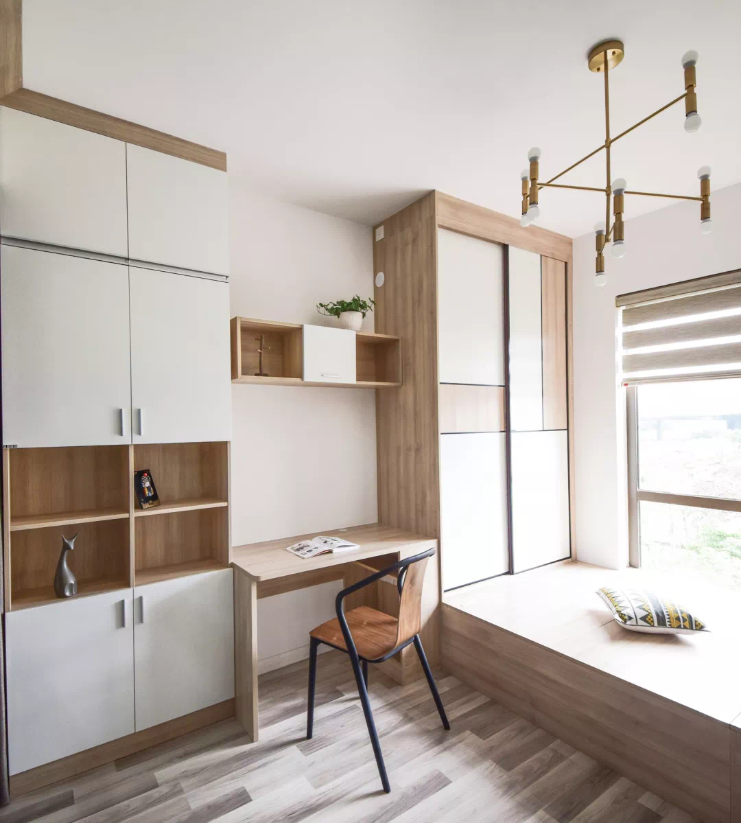 多功能房间采用了榻榻米与书桌的结构,木色的搭配使得整个空间更加的空旷,白色与木色撞色也会更加和谐 。