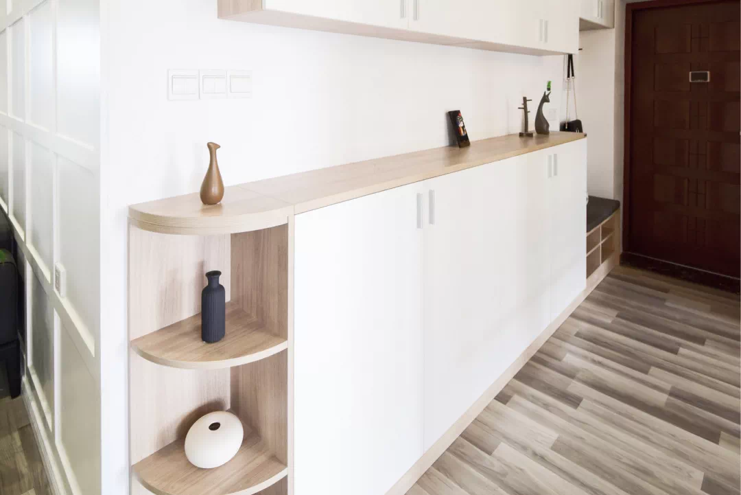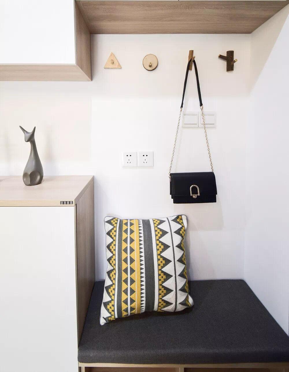 进门处设立了换鞋凳,进出时也能享受一刻舒适,墙上的挂勾方便上下班时挂衣服与包包。