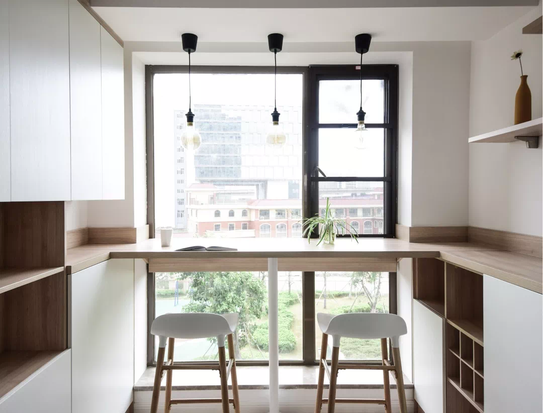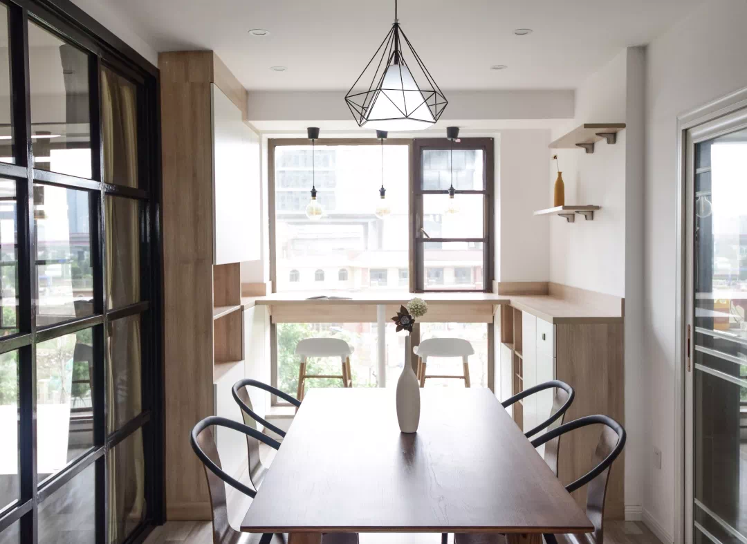 设计师在餐厅窗户处设置了吧台,与两侧的收纳柜连接,让居家生活更加轻松随性的同时也提升了空间的实用性。
