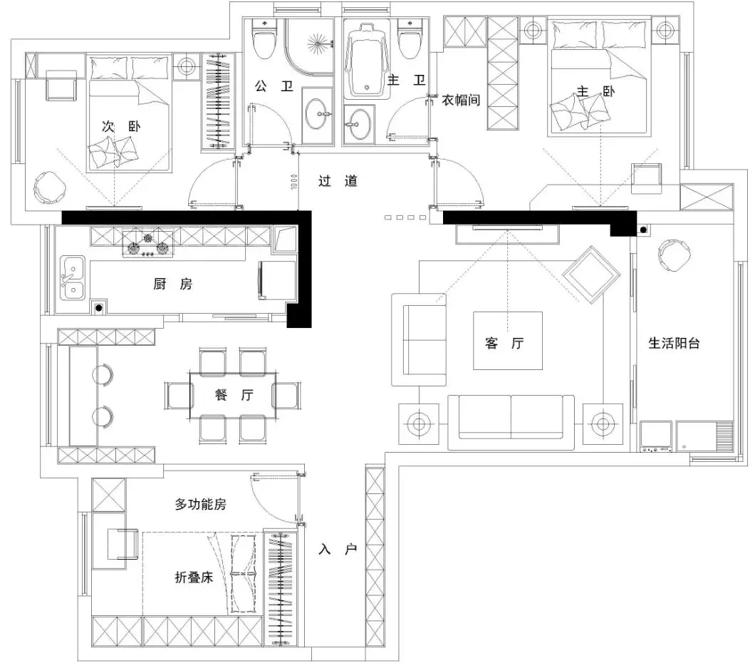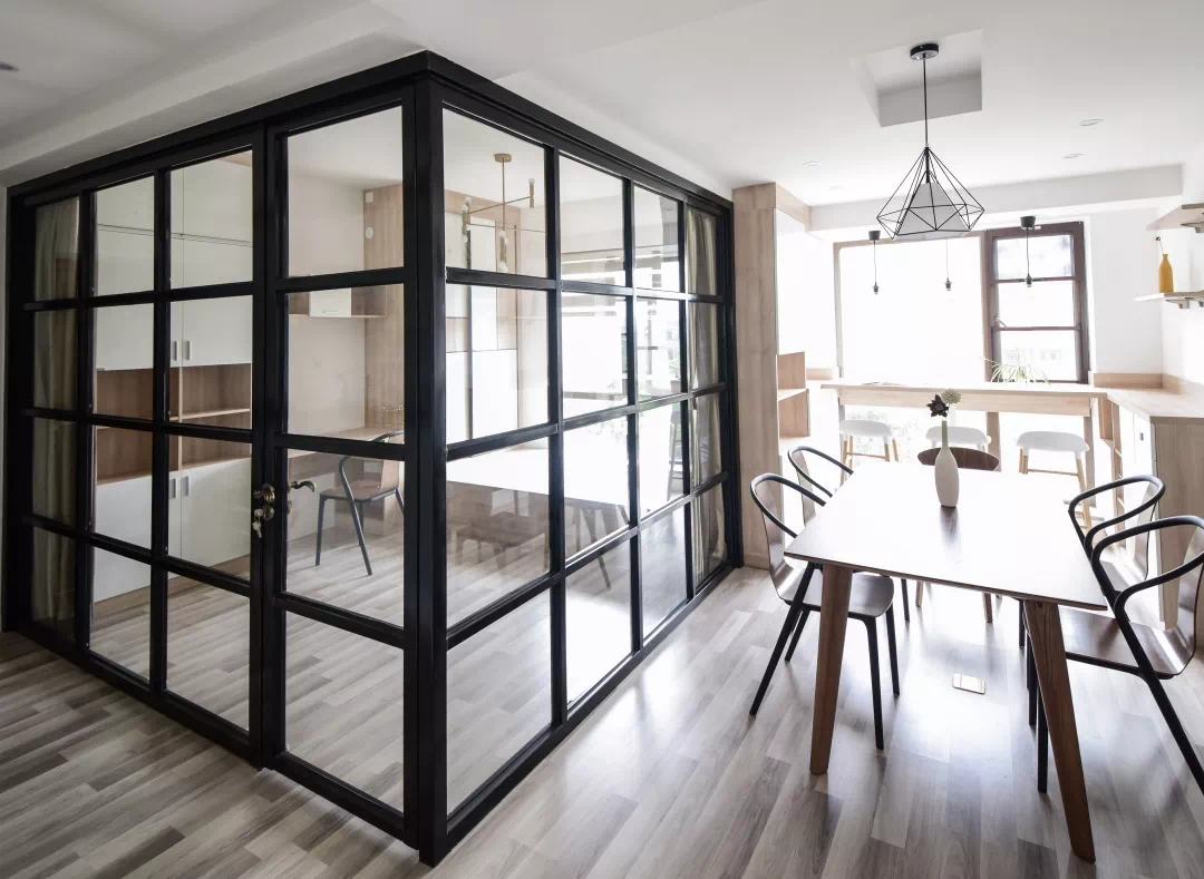 △改造后,多功能房折线处的墙体移除,改为全玻璃构造。