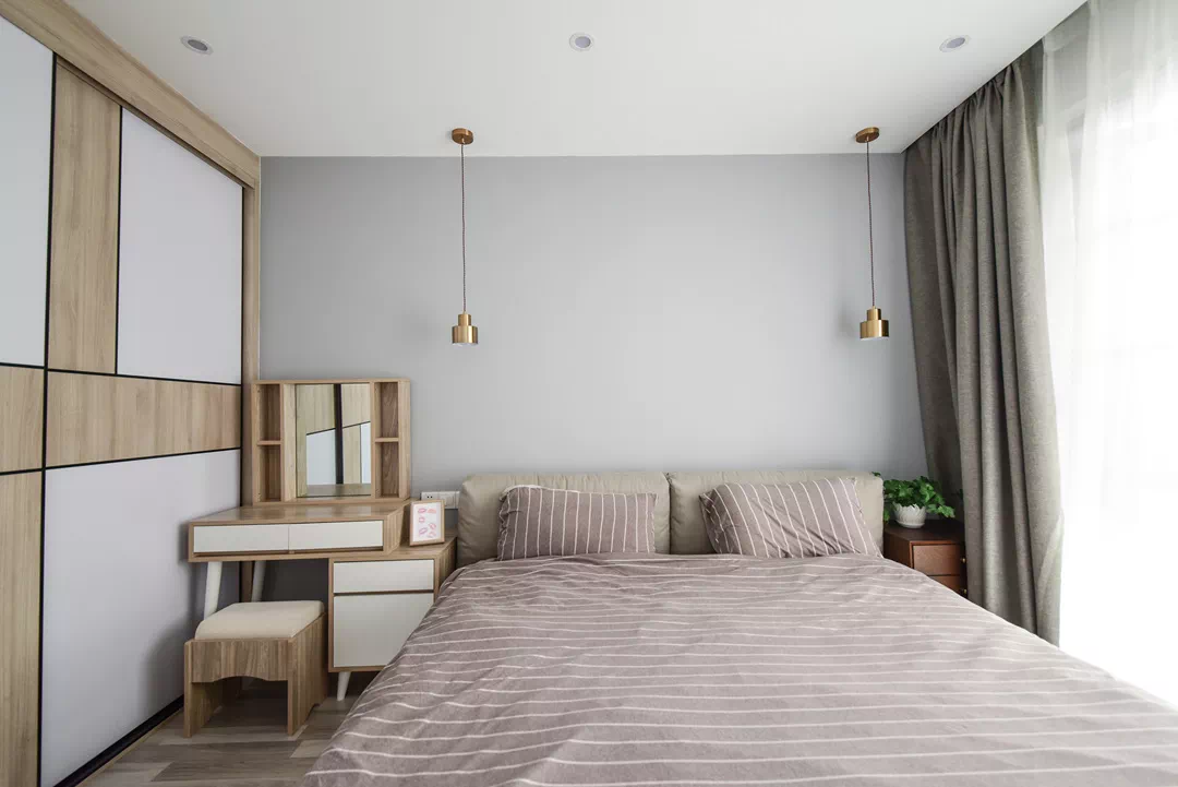 卧室色调以浅木色、白色、米色等浅色调为主,并适当地加以低饱和度的纯色作为点缀,给人时尚明朗、整齐干净的视觉感受。