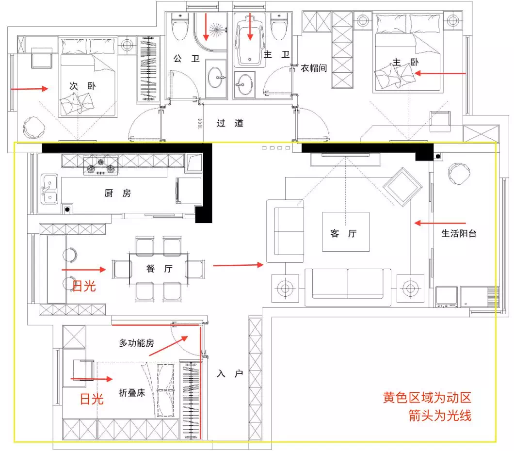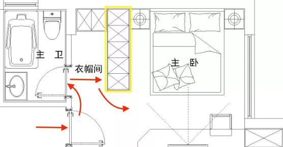 △黄色区域:衣柜,用于隔断主卫和卧室。