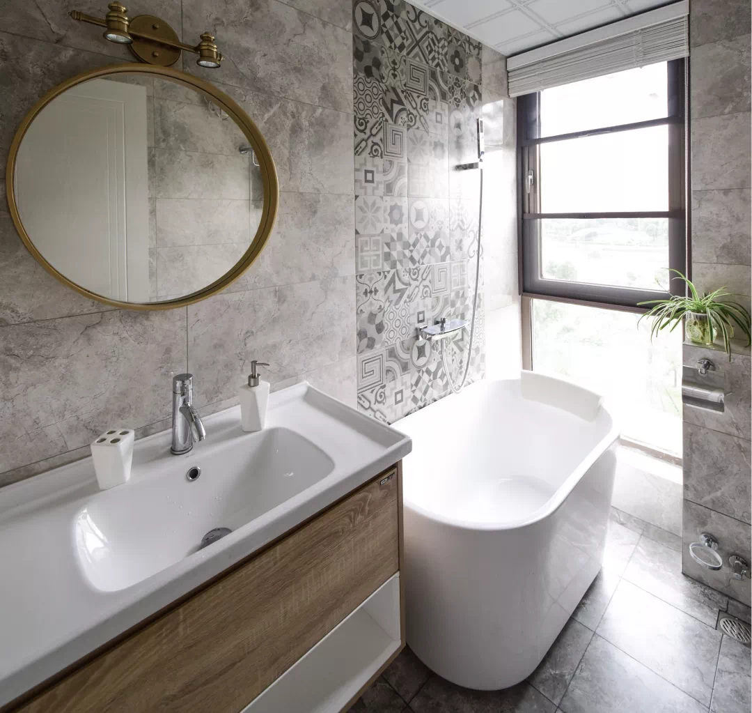 花砖与白色浴缸的搭配既大胆也恰到好处,白色与木色相得益彰的搭配也保证了浴室柜的整体效果,使得各个部分的拼接混搭显得自然。同时,绿植的摆放保证了室内的通透性。