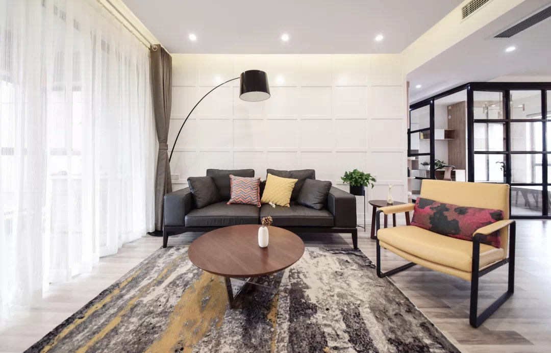 桌子脚下的异色地毯,与沙发色彩呼应,清晰地展示了其特性,将客厅与其他区域区分开来。