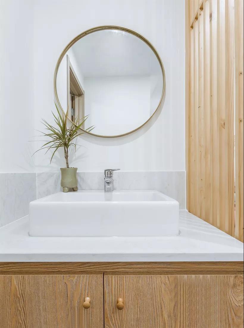 主卫,以自然系的白色 + 浅木色为主,墙面挂了一面黄铜圆镜,虽然整体的布局看上去很简单但是并没有给人单调的感觉,设计的巧思令这个空间看上去十分的精巧别致。