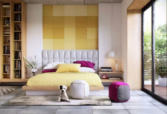 3.白色和淡黄色为卧室带来了春天的气息。床头一侧的落地书架设计增添了文化气息,软包床头板有着柔软的触感。