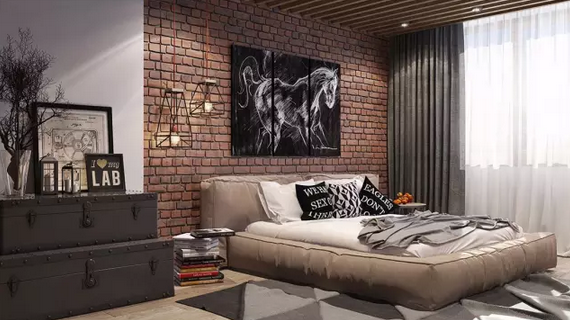 4.软软的气垫床与砖墙形成了反差,铆钉复古箱子又带来了别样的味道。裸露的砖墙一直有着大批粉丝,砖墙与木质天花板都是自然的元素。