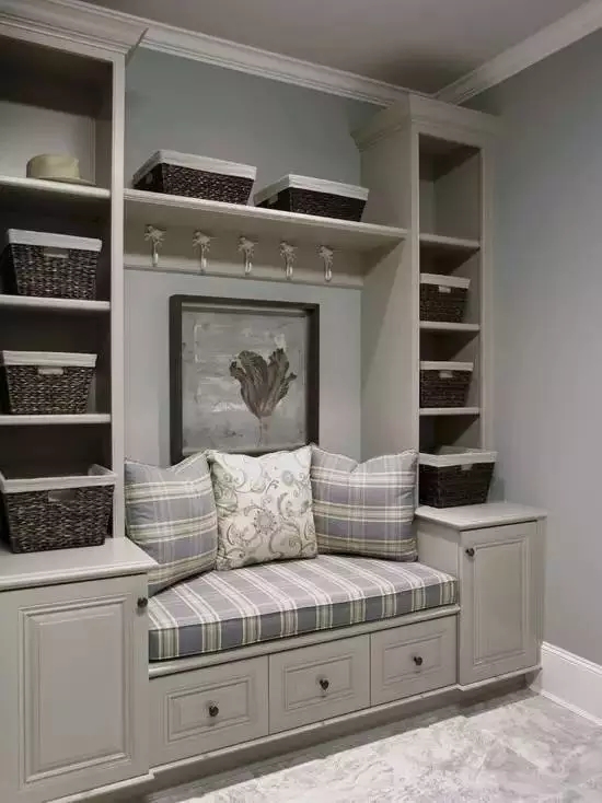 充分利用居室的每一寸空间,是我们家装原则之一,不放过任何一个可利用的空间,包括玄关,用于收纳、挂衣服、帽子和钥匙等。内嵌式的储物空间或者储物柜,不仅将玄关充分利用起来,还彰显了主人的品味。