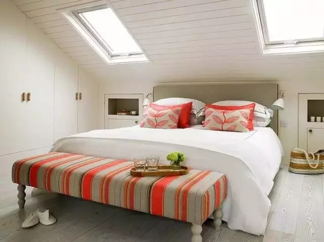➡处于阁楼的卧室,白色的背景搭配两扇天窗,使整个空间变得宽敞明亮。