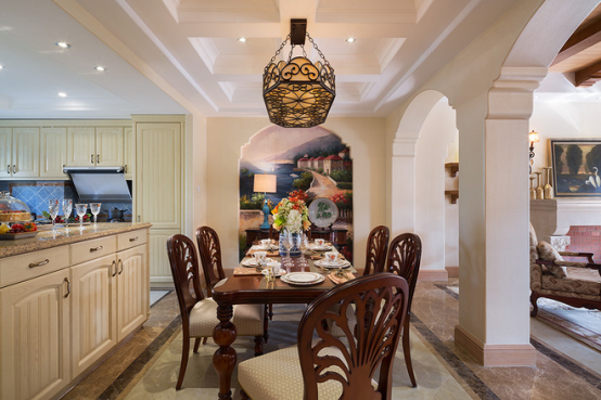 这种布置就餐时上菜快速简便,能充分利用空间,较为实用。只是需要注意不能使厨房的烹饪活动受到干扰,也不能破坏进餐的气氛。要尽量使厨房和餐室有自然的隔断或使餐桌布置远离厨具,餐桌上方应设集中照明灯具。