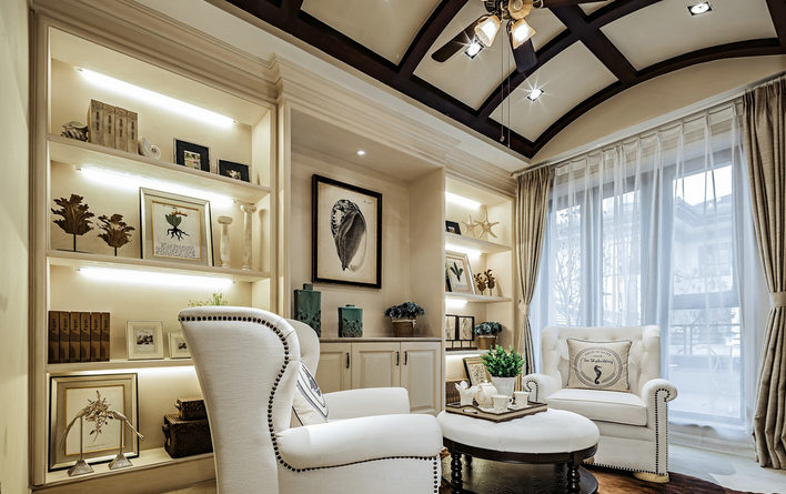 众所周知,如果书桌是直接和阳光在一起的话,那么那样的话对眼睛的伤害是非常大的,因此要避免这种情况出现。在书房中白天也许是使用自然光进行照明,可是到了晚上都是要依仗室内灯光效应,书房室内灯光不能够过于的集中,要具有分散性。照明光源最好从书桌的侧面射入进来,如此能够便于保护眼睛。